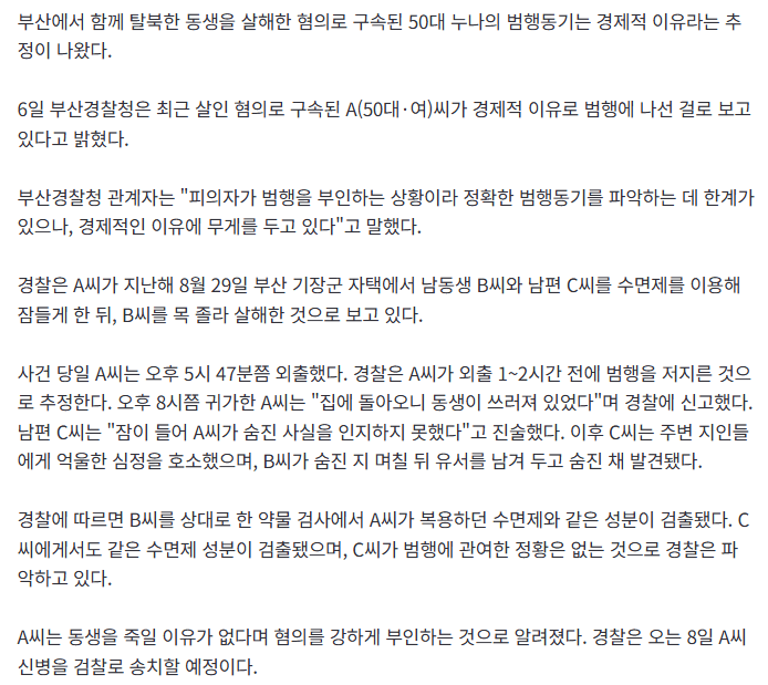 '부산 탈북 동생 살인 사건' 범행동기, 경제적 이유로 추정