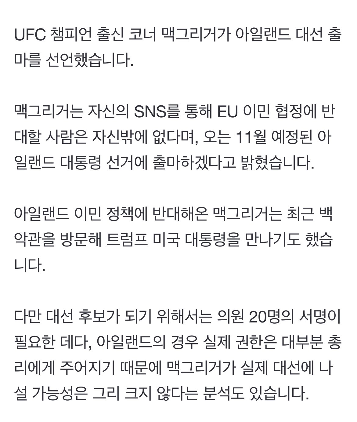 전 UFC 챔피언 코너 맥그리거, 아일랜드 대선 출마 선언