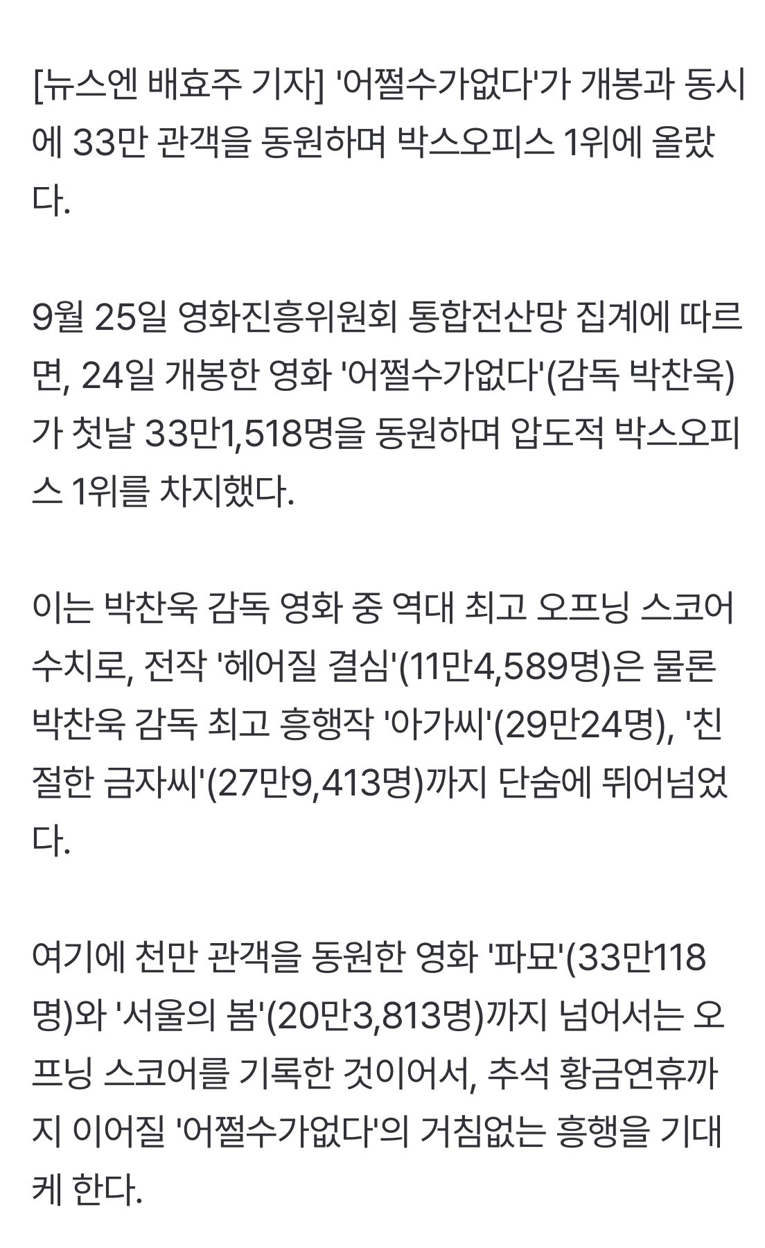 ‘어쩔수가없다’ 첫날 33만명 봤다...박찬욱 역대 최고 스코어[박스오피스]