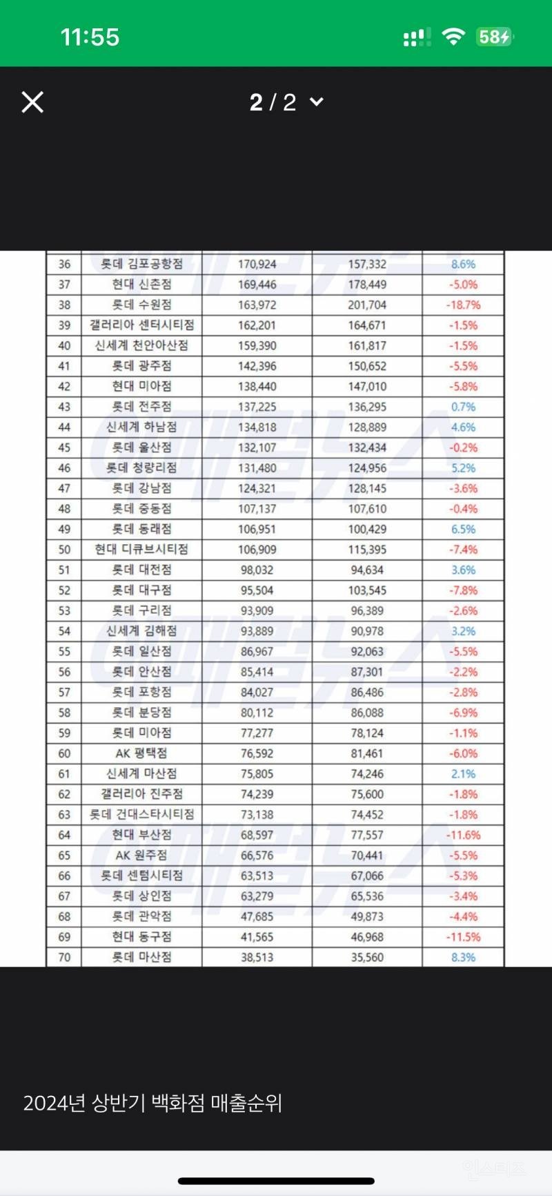 2024 상반기 백화점 매출 순위 1-70위