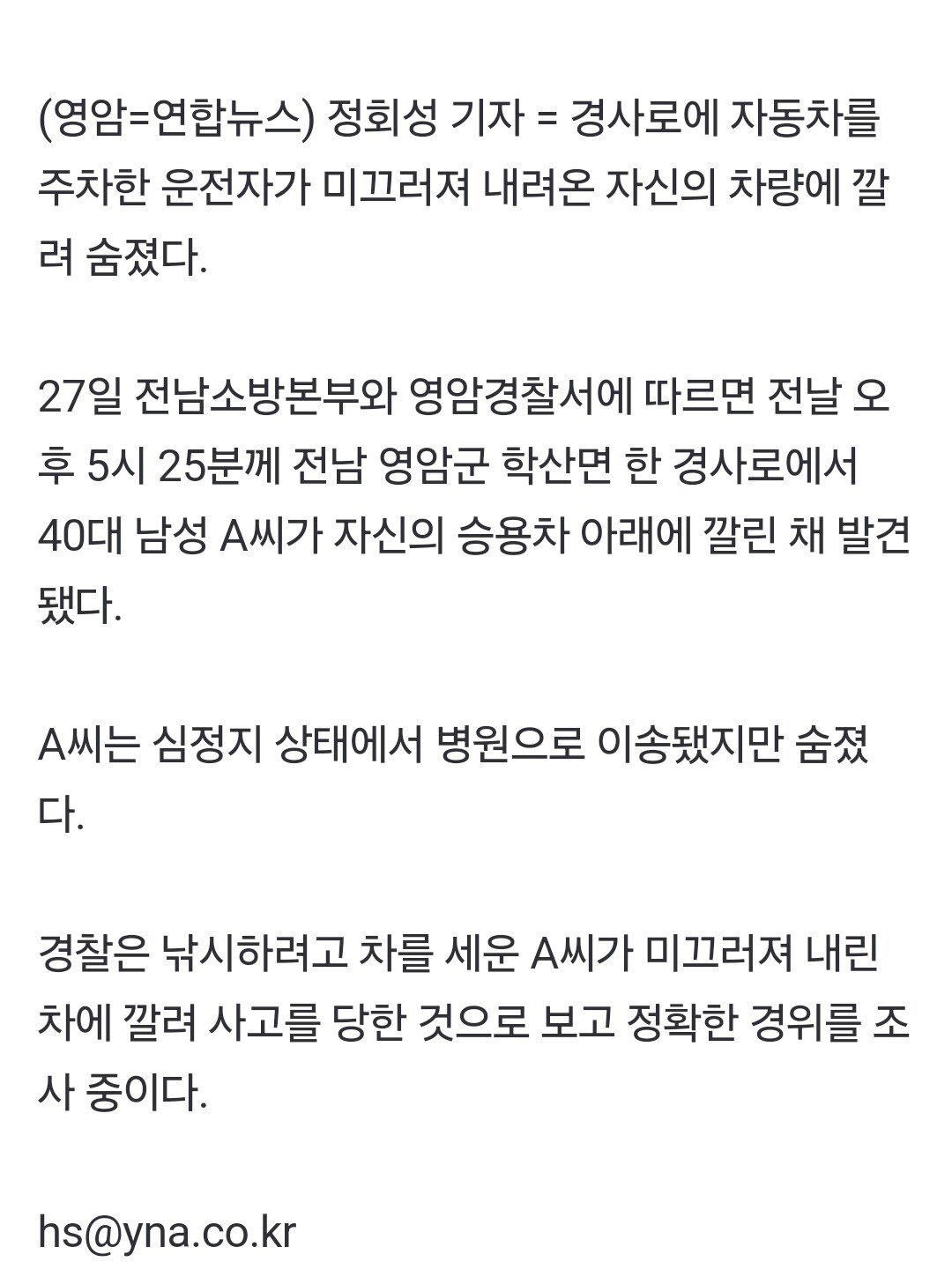 경사로에 주차했다 미끄러져 내려온 자신 차량에 깔려 숨져