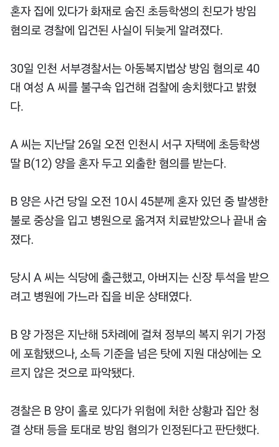 집에 혼자 있다 화재로 숨진 초등생 어머니, 방임 혐의로 검찰 송치