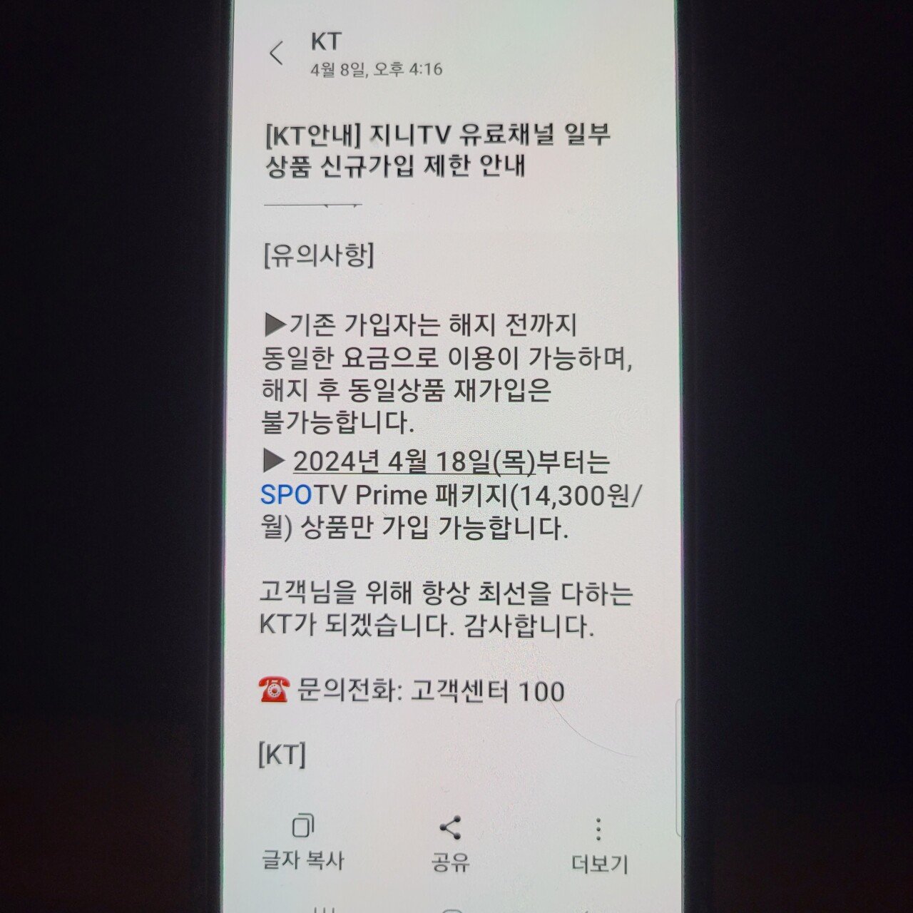 스포티비 에서 KT를 통해 보내온 공지사항...