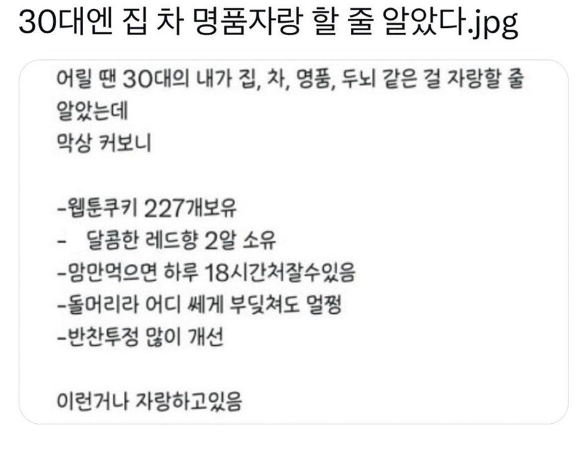30대에는 집, 차, 명품 자랑할 줄 알았는데ㅋㅋㅋ