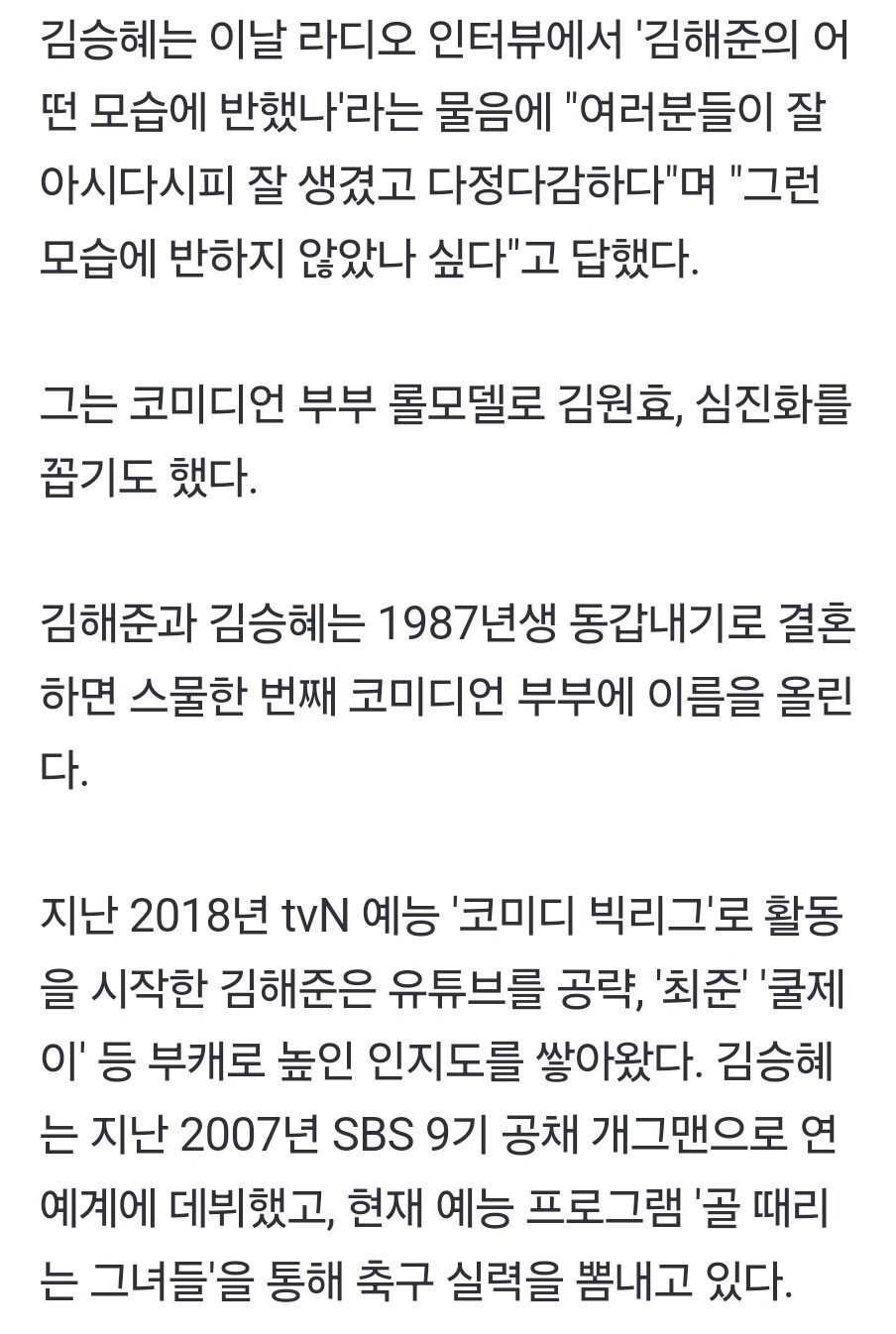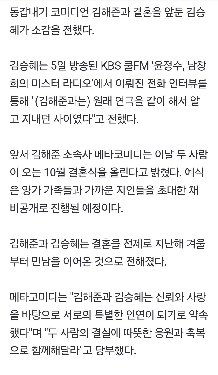코미디언 김해준과 결혼 김승혜 "다정다감한 모습에 반했다"
