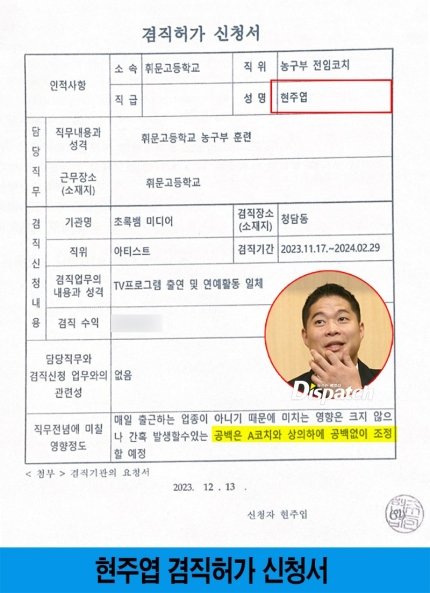'디스패치'가 교육청에 문의한 결과, 현주엽은 해당되지 않았다. 현주엽의 경우 교직원이 아니라 운동부 계약직이라는 것. 또한 휘문고는 국공립이 아니라, 자율형 사립고다.