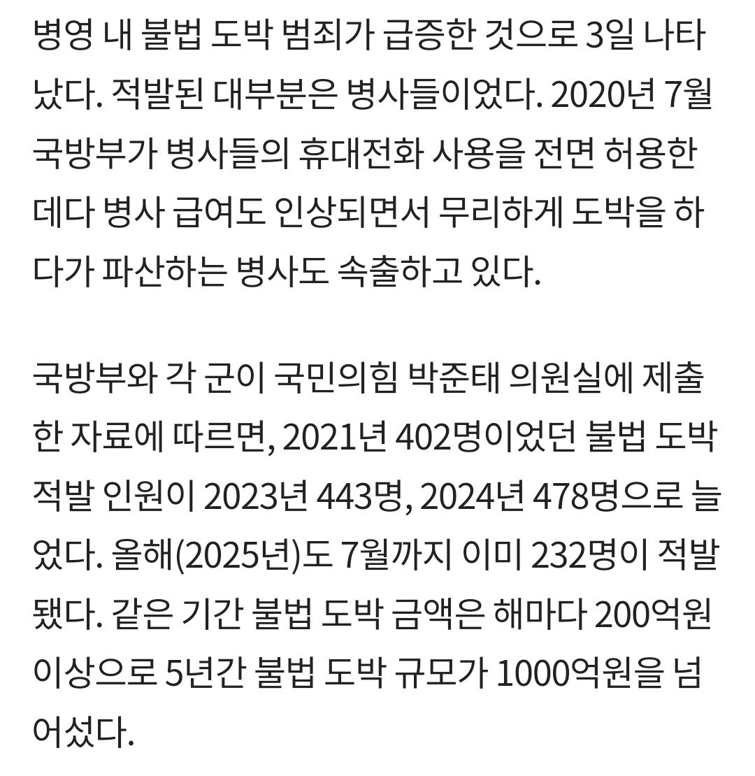 2021년 전체 도박 사범 402명 중 348명(86.6%)이 병사였고, 2022년 88.5%, 2023년 87.8%, 2024년 89.5%였다. 올해도 상반기까지 전체 232명 중 210명(90.5%)이 병사
